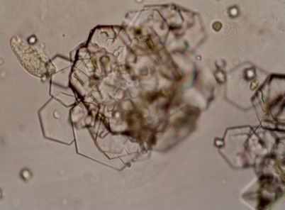 Açıklama: 400x büyütmede idrar sedimenti mikroskopisi. Fotoğrafta sistin kristalleri görünüyor. |