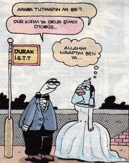DOLMUŞTA Yolcu müsait bir yerde inmek ister ama dili sürçer: —Şoför bey mübarek bir yerde inebilir miyim? —Şu ilerdeki caminin önünde bırakayım teyze seni... *** Yolcu müsait bir yerde inmek ister ama dili sürçer: —Müsait bir yerde iner misiniz? Şoför: —Niye sen mi kullanacaksın? *** —Mükemmel bir yerde inebilir miyim? Yolcunun kafası karışık sanırım, kendisi de dolmuştakilerle birlikte güler söylediğine şoför kadını indirirken: —Buyurun size layık değil ama! *** Kadın: —Kızım dur! Ben vereyim benim ki bozuk zaten... Kızı: —Aman ne olacak sanki nasılsa benimki de bozulacak, ben vereyim! *** Oğlum bu Eminönü'nden geçer mi? —Yok, teyze biz Taksim'e çıkıyoruz. —Hah tamam oğlum siz gidin ben gelmeyeceğim. *** Yolcu: —Abi Heykel'e çıkıyor mu? Şoför: —Yok, yanından geçiyor. *** Arkadaki aksi teyze öndeki uzun saçlı delikanlıya seslenir: —Kızım şuradan bir kişi uzatır mısın? —Ben kız değilim! —Aman ne bileyim kız mısın dul musun, uzat işte.